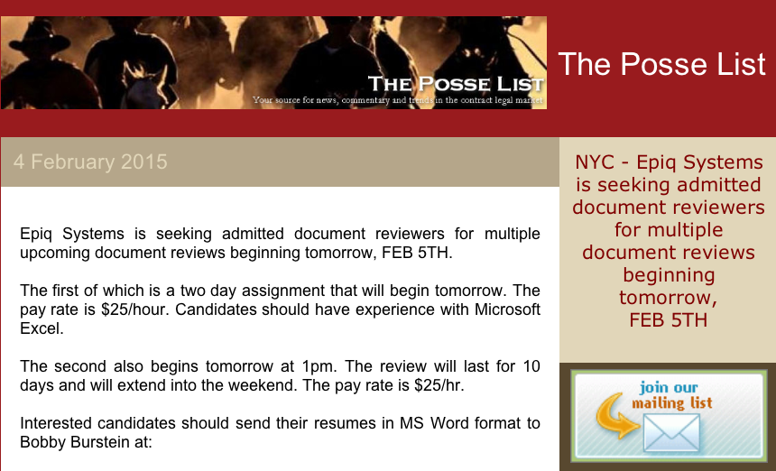 Meanwhile, I noticed another dramatic change today, a steep decline in the going hourly rate that agencies are paying attorneys to review documents for their clients, presumably for discovery for various types of matters. Last week the same agency was paying a minimum of $29. Today a whopping $25 per hour – flat. $200 less in take home pay per week for ten hour days (which is usual for projects like these).